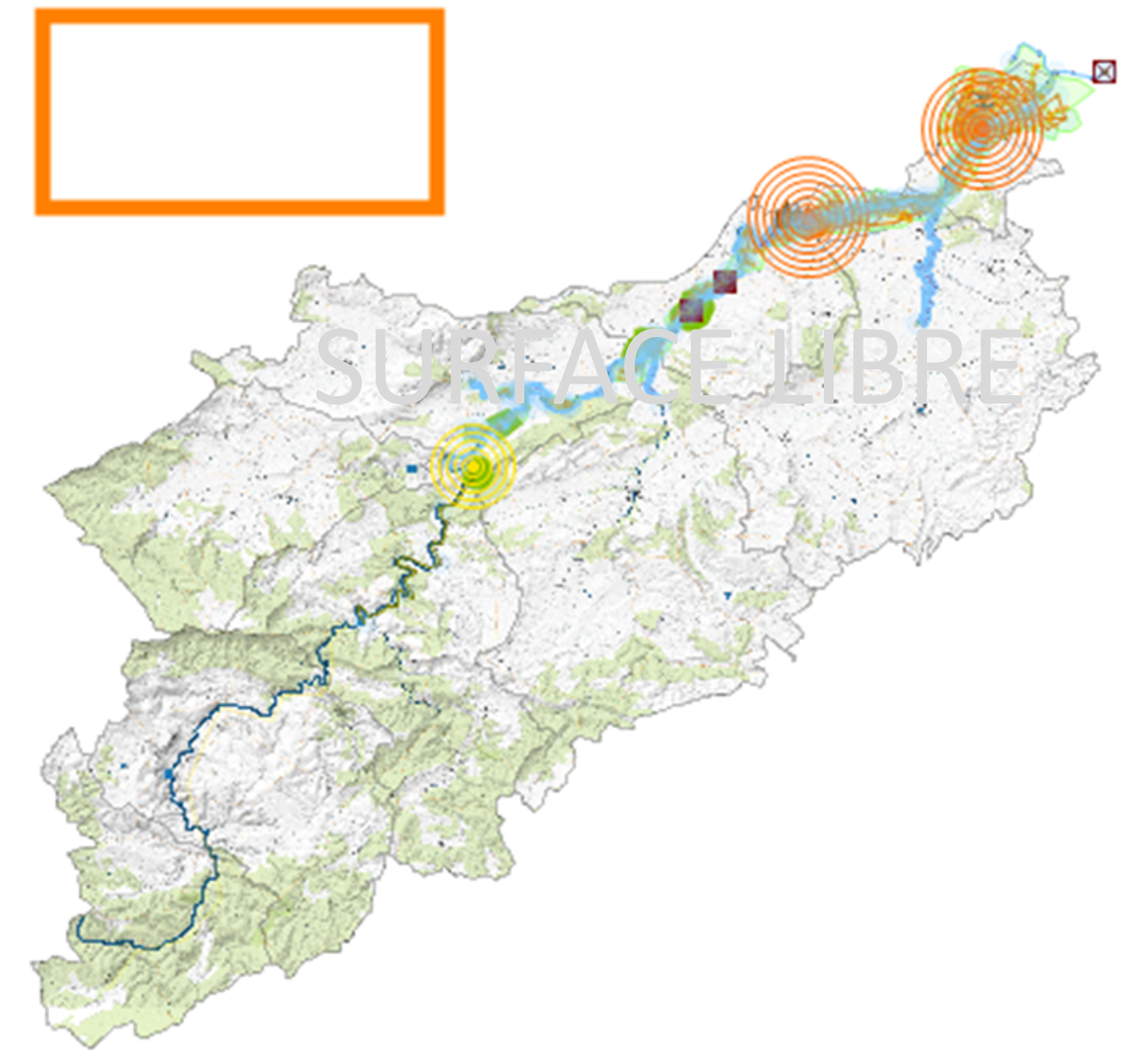 A gauche, les dépassements de niveaux de vigilance aux stations sont affichées sur le cours d'eau (cercles orange, jaunes, etc...). Le rectangle reprend l'alerte maximale sur le réseau modélisé.
